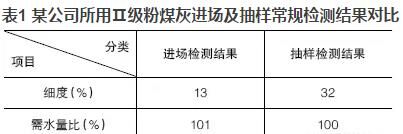 優(yōu)質(zhì)的粉煤灰摻入混凝土可明顯地改善混凝土的和易性,當(dāng)粉煤灰摻量大于膠材總量的5%~10%時(shí),效果極為明顯?,F(xiàn)今在混凝土實(shí)際生產(chǎn)中,粉煤灰摻量往往達(dá)到20%,有的甚至高達(dá)30%,但混凝土的和易性卻不盡人意。抽取原材料進(jìn)行檢測時(shí),發(fā)現(xiàn)粉煤灰的檢測結(jié)果經(jīng)常不滿足標(biāo)準(zhǔn)要求或者與驗(yàn)收時(shí)的結(jié)果相差甚遠(yuǎn)。現(xiàn)以某公司所用Ⅱ級粉煤灰進(jìn)場及抽樣常規(guī)檢測結(jié)果進(jìn)行對比,見表1。