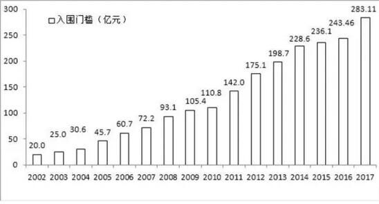 中國(guó)企業(yè)500強(qiáng)的入圍門檻及增幅(2002-2017)