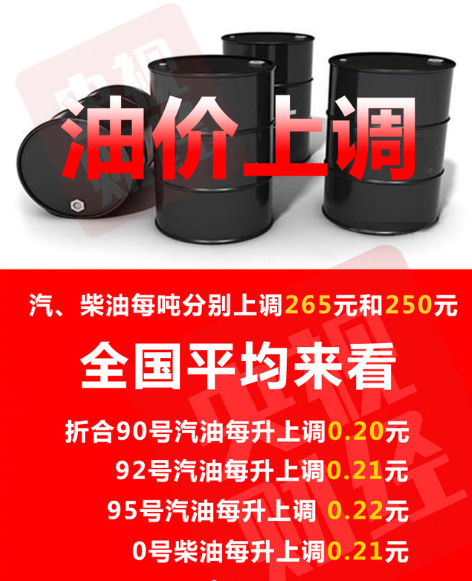 此次油價調(diào)整具體為:每噸汽油上調(diào)265元、柴油上調(diào)250元。