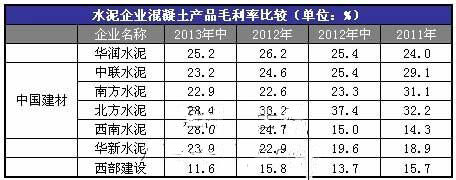 水泥企業(yè)混凝土產(chǎn)品毛利率比較(單位:%)
