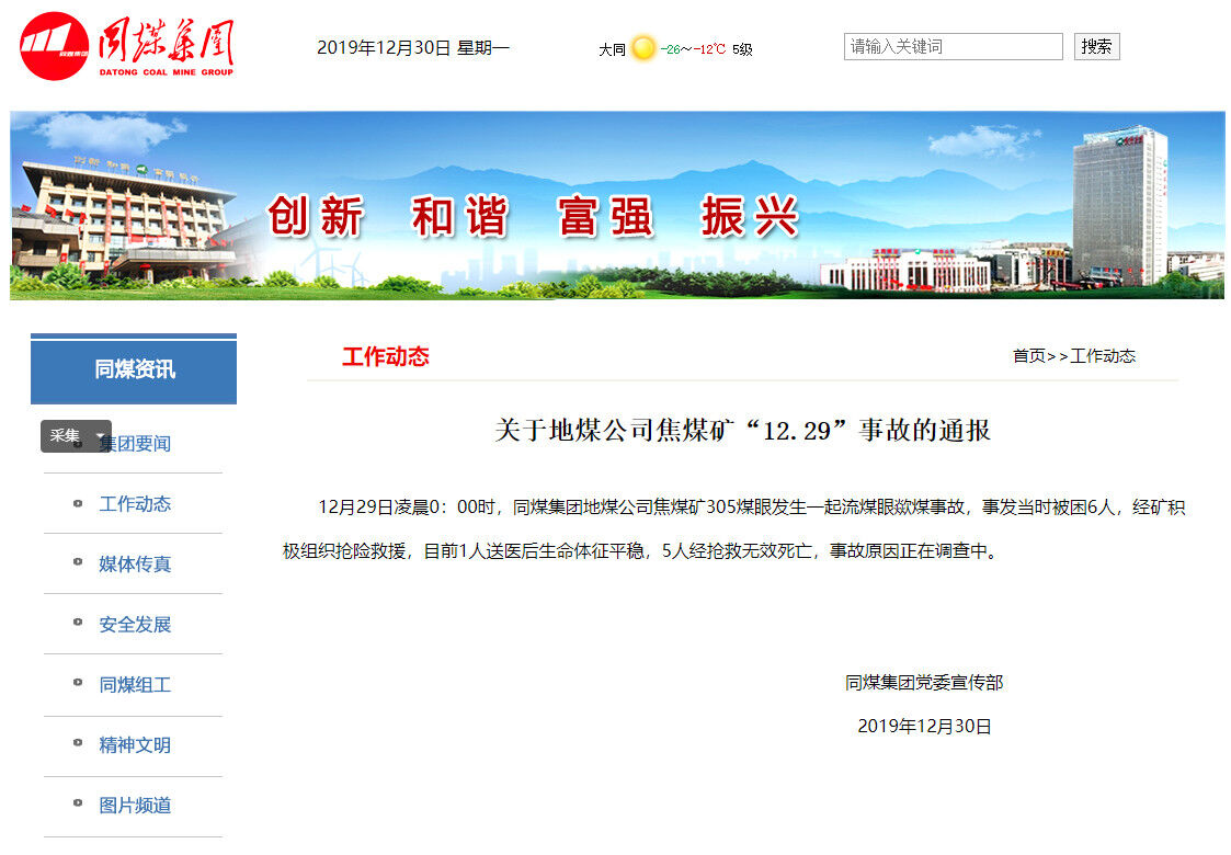 聲威水泥事故受困人員與死神擦肩而過,可謂有驚無險。可是同煤集團受困人員就沒有那么幸運了,12月29日凌晨0時,同煤集團地煤公司焦煤礦305煤眼發(fā)生一起流煤眼歘煤事故,事發(fā)當(dāng)時6人被困,經(jīng)積極組織搶險救援,目前1人送醫(yī)后生命體征平穩(wěn),5人經(jīng)搶救無效死亡,事故原因正在調(diào)查中。