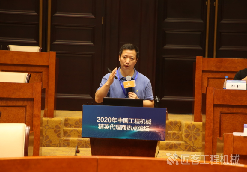 中國工程機(jī)械工業(yè)協(xié)會代理商工作委員會秘書長、匠客工程機(jī)械傳媒總經(jīng)理?xiàng)钪痉贾鞒稚衔绲臅h并發(fā)言
