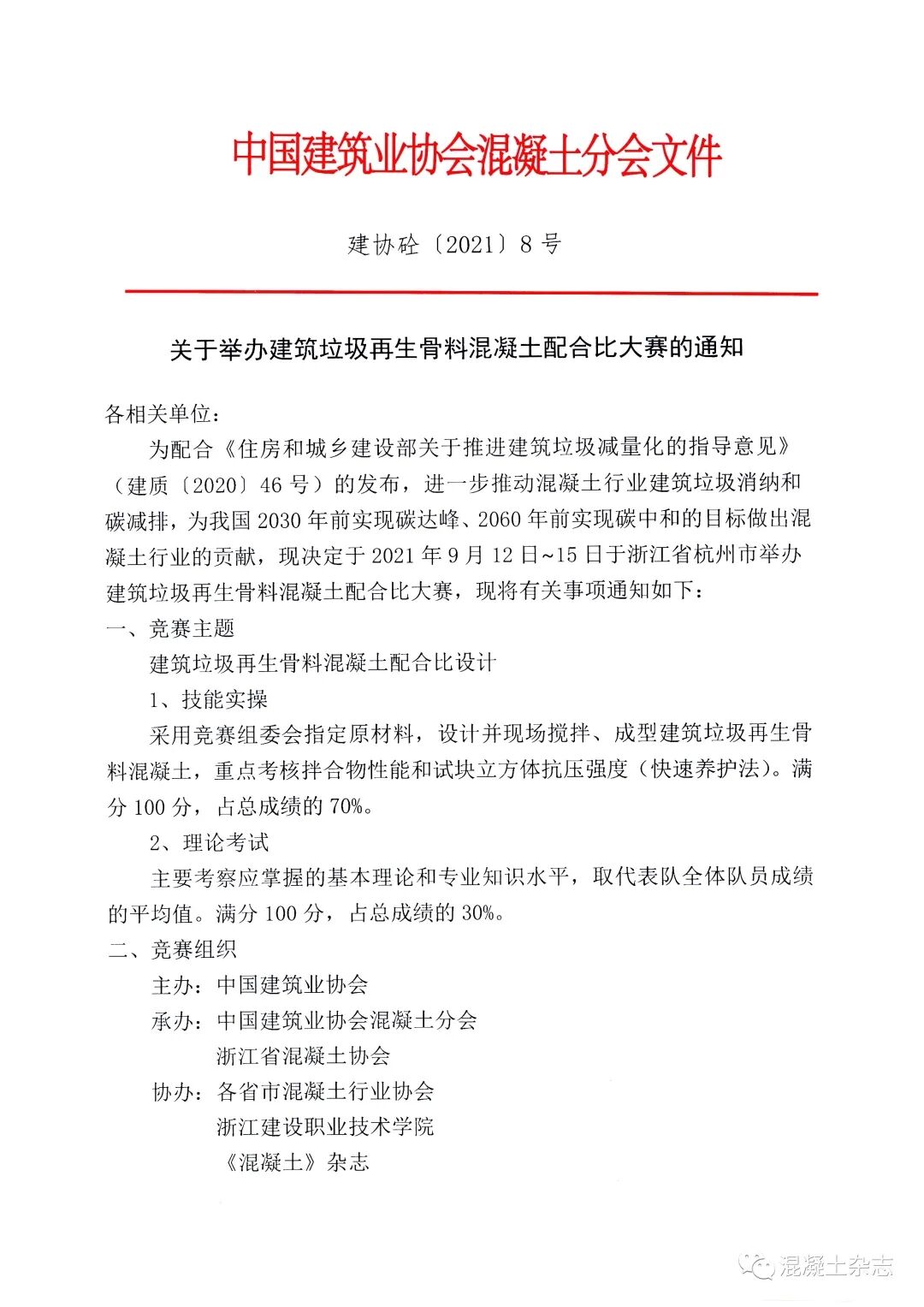 為配合《住房和城鄉(xiāng)建設(shè)部關(guān)于推進(jìn)建筑垃圾減量化的指導(dǎo)意見》(建質(zhì)〔2020〕46號)的發(fā)布,進(jìn)一步推動混凝土行業(yè)建筑垃圾消納和碳減排,為我國2030年前實(shí)現(xiàn)碳達(dá)峰、2060年前實(shí)現(xiàn)碳中和的目標(biāo)做出混凝土行業(yè)的貢獻(xiàn),現(xiàn)決定于2021年9月12日~15日于浙江省杭州市舉辦建筑垃圾再生骨料混凝土配合比大賽。