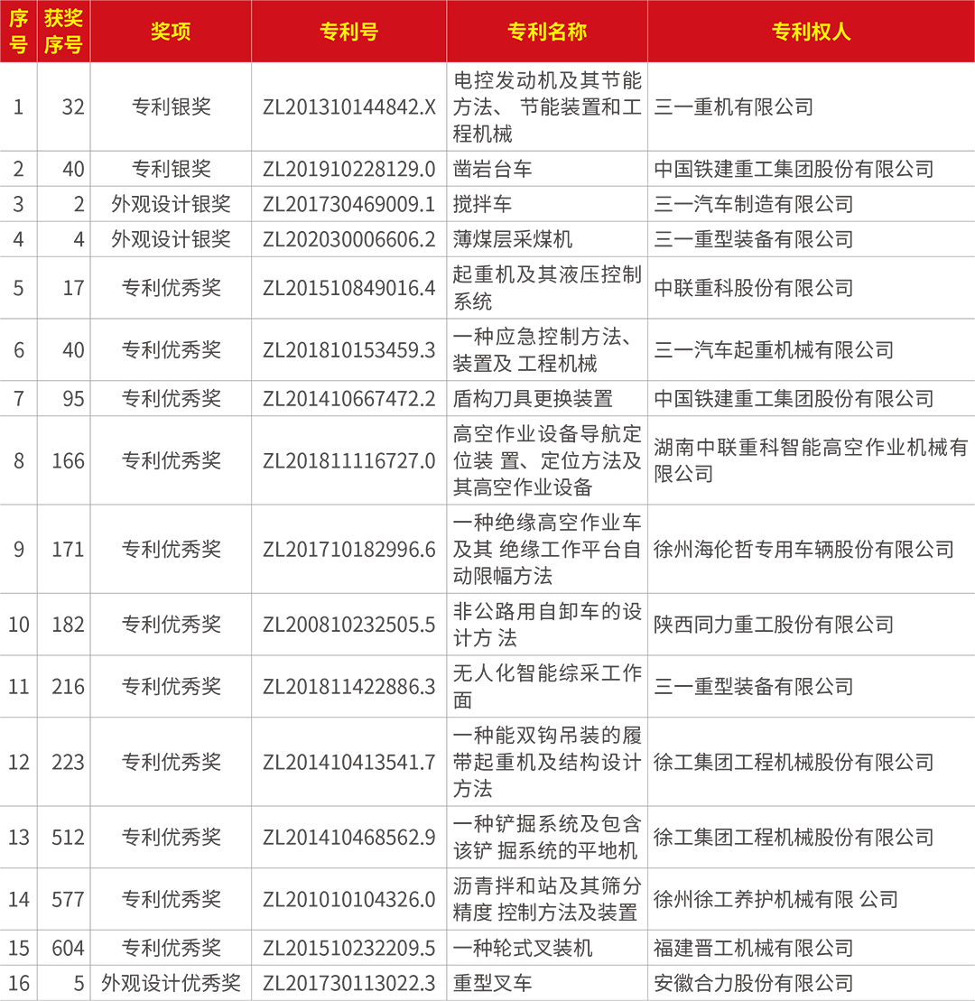 本屆評選活動中,中國工程機械行業(yè)共有十六項專利榮獲“中國專利獎”,其中兩項獲專利銀獎,兩項獲外觀設計銀獎,十一項獲專利優(yōu)秀獎,一項獲外觀設計優(yōu)秀獎。