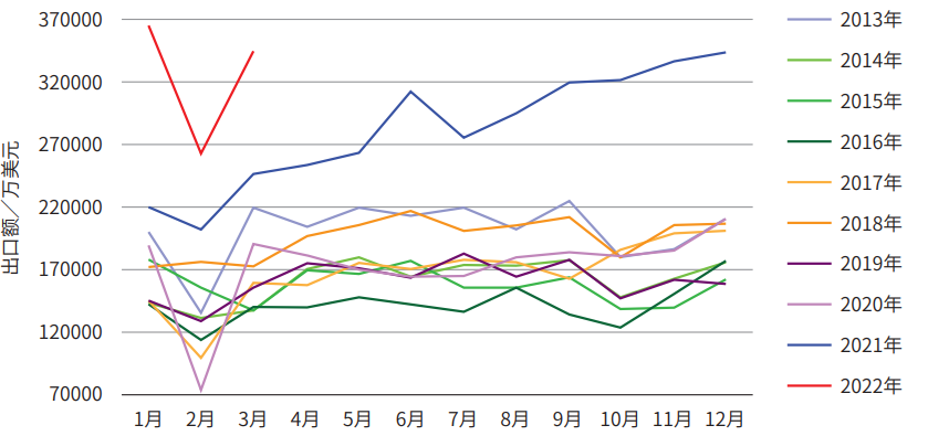 根據(jù)海關(guān)數(shù)據(jù)整理,2021年1-3月我國工程機(jī)械進(jìn)出口貿(mào)易額為105.08億美元,同比增長36%。其中進(jìn)口金額7.85億美元,同比下降22.8%;出口金額97.23億美元,同比增長45%,貿(mào)易順差89.38億美元,同比增加32.49億美元。2022年1-3月各月進(jìn)出口情況如表1所示,2013年-2022年月度出口金額如圖1所示。