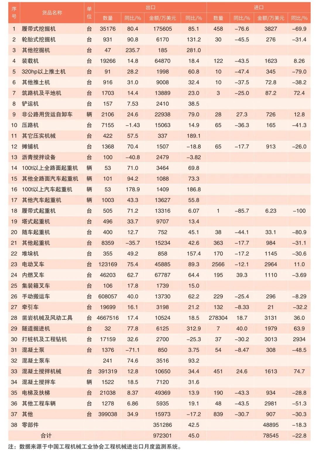 2022年3月進(jìn)口額2.61億美元,同比下降31.2%;出口額34.37億美元,同比增長39.3%。進(jìn)口方面,2021年1-3月,零部件進(jìn)口4.89億美元,同比下降18.3%;占進(jìn)口總額的62.3%,進(jìn)口整機(jī)2.97億美元,同比下降29.3%,占進(jìn)口總額的37.7%。在進(jìn)口主要產(chǎn)品中,履帶挖掘機(jī)進(jìn)口數(shù)量下降76.6%,進(jìn)口金額下降69.9%,進(jìn)口額減少0.89億美元;零部件進(jìn)口額增加1.1億美元。進(jìn)口額下降主要產(chǎn)品有:履帶挖掘機(jī)、其他工程車輛、履帶式起重機(jī)、大馬力推土機(jī)等。進(jìn)口額增長的主要產(chǎn)品有:打樁機(jī)及工程鉆機(jī)、鑿巖機(jī)械和風(fēng)動工具、隧道掘進(jìn)機(jī)、混凝土攪拌機(jī)械等。
