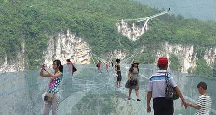 號(hào)稱世界最長(zhǎng)、最高的全透明玻璃橋———據(jù)遺產(chǎn)日?qǐng)?bào): 張家界大峽谷玻璃橋?qū)⒂?月向游客開放。玻璃橋總長(zhǎng)430米、寬6米,橋面距谷底約300米,可站800人。整個(gè)工程無鋼筋混凝土橋墩,同時(shí)肩負(fù)蹦極、溜索、舞臺(tái)等多種功能。