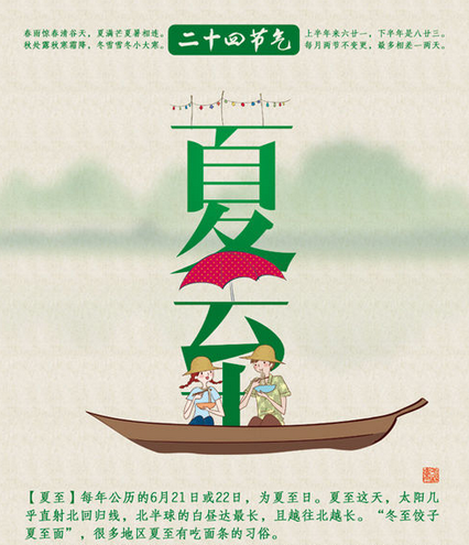 夏至是二十四節(jié)氣中最早被確定的一個節(jié)氣。公元前七世紀,先人采用土圭測日影,就確定了夏至。每年的夏至從6月21日(或22日)開始,至7月7日(或8日)結束。據(jù)《恪遵憲度抄本》:“日北至,日長之至,日影短至,故曰夏至。至者,極也?!毕闹吝@天,太陽直射地面的位置到達一年的最北端,幾乎直射北回歸線(北緯23°26\'),北半球的白晝達最長,且越往北晝越長。如海南的??谑羞@天的日長約13小時多一點,杭州市為14小時,北京約15小時,而黑龍江的漠河則可達17小時以上。夏至以后,太陽直射地面的位置逐漸南移,北半球的白晝?nèi)諠u縮短。民間有“吃過夏至面,一天短一線”的說法。而此時南半球正值隆冬。