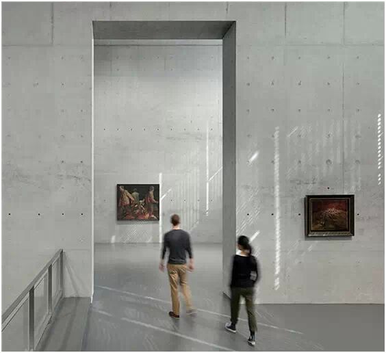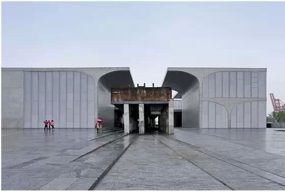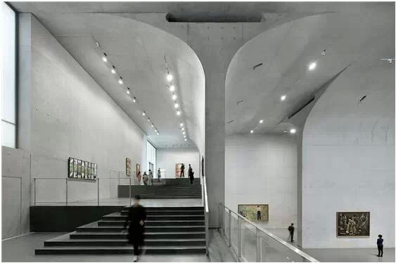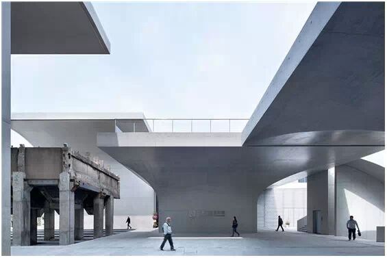 在“傘拱”結(jié)構(gòu)的空腔里,地面以上的“傘拱”覆蓋空間,墻體和天花均為清水混凝土的表面,它們的幾何分界位置也變得模糊。這樣的結(jié)構(gòu)性空間,在形態(tài)上不僅對人的身體形成庇護(hù)感,亦與保留的江邊碼頭的煤料斗產(chǎn)生視覺呼應(yīng)。建筑的內(nèi)部空間也得以呈現(xiàn)一種原始的野性魅力,而有著大小調(diào)節(jié)的空間尺度以及留有模板拼縫和螺栓孔的清水混凝土表面又會帶來一種現(xiàn)實感。這種“直白”式的結(jié)構(gòu)、材料、空間所形成的直接性與樸素性,加上大尺度出挑所產(chǎn)生的力量感或輕盈感,使整個建筑與原有場地的工業(yè)特質(zhì)間取得一種時間與空間的接續(xù)關(guān)系。地面以上的清水混凝土“傘拱”下的流動展覽空間和地下一層傳統(tǒng)“白盒子”式的展覽空間由一個呈螺旋回轉(zhuǎn)、層層跌落的階梯空間聯(lián)接,既原始又現(xiàn)實的空間和古代、近代、現(xiàn)代直到當(dāng)代藝術(shù)的展覽陳列,這種并置的張力,呈現(xiàn)出一種具有時間性的展覽空間。