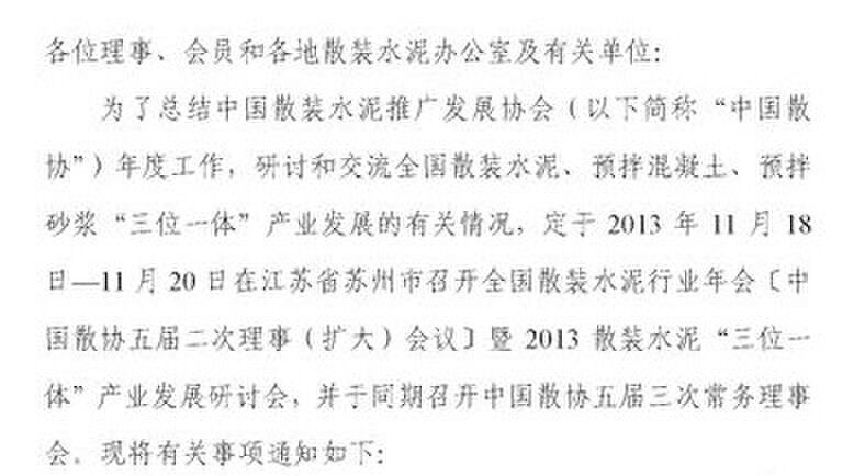 摘要:關(guān)于召開全國散裝水泥行業(yè)年會(huì)暨2013散裝水泥“三位一體”產(chǎn)業(yè)發(fā)展研討會(huì)的通知