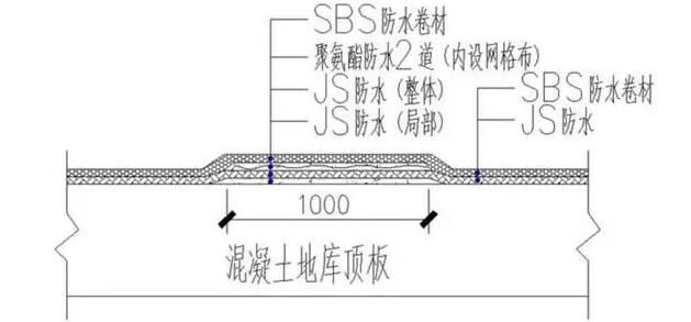 頂板混凝土養(yǎng)護(hù)后,冷縫處混凝土加強(qiáng)處理,設(shè)置防水附加層,為了保障地庫頂板防水效果,現(xiàn)場在冷縫處1m范圍進(jìn)行防水附加層,具體做法如下:
