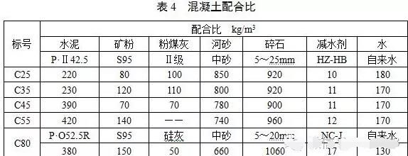 各標(biāo)號(hào)混凝土工作性能良好,坍落度在180mm~210mm之間,無離析、泌水現(xiàn)象,各標(biāo)號(hào)混凝土配合比如表4所示。