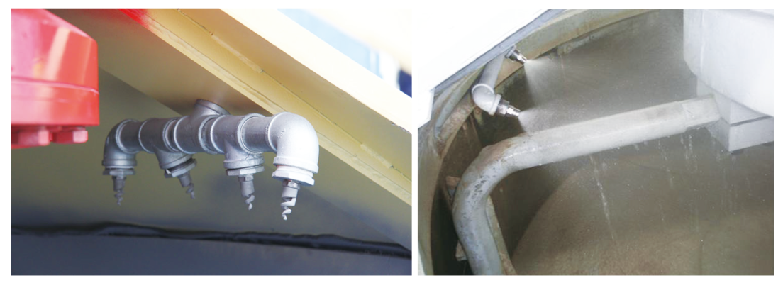 水路采用上置式結(jié)構(gòu)(專利產(chǎn)品),解決管路中殘余外加劑和水的現(xiàn)象,避免可客戶換配方時(shí)造成損失。噴頭采用螺旋形實(shí)心圓錐形噴嘴,具有細(xì)密均勻的霧化效果,覆蓋面積大,使物料攪拌均勻。