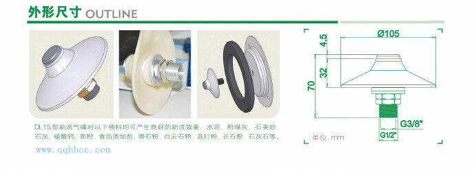 助流氣蝶前部是多孔金屬,外部通入的高壓空氣,經(jīng)過氣嘴后均勻分散在氣嘴周圍,促使粉料流動,達(dá)到助流效果。流化效果由氣嘴數(shù)量確定,不同的粉料及容器狀況需要不同數(shù)量的氣嘴。本產(chǎn)品具有安裝維護(hù)方便,價格低廉、流化效果明顯等突出優(yōu)點(diǎn)。 是水泥倉頂除塵器,攪拌站倉頂除塵器,以及水泥罐倉頂除塵器重要元件。