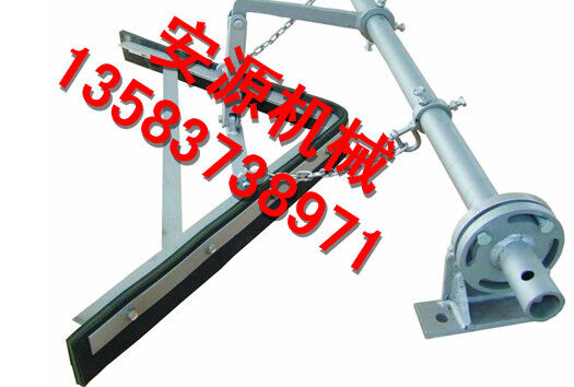 在正機安裝時,首先確定好安裝位置,將前吊桿焊在清掃器三角板上,再將橫粱焊在機架上,前吊桿調(diào)正螺絲頂在橫梁上,調(diào)正刮板與膠帶距離,后吊環(huán)角鐵焊在機架槽綱下面,吊著清掃器尾部,自動調(diào)正清掃器