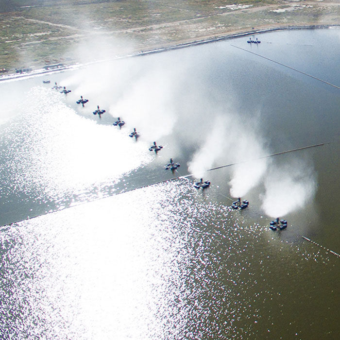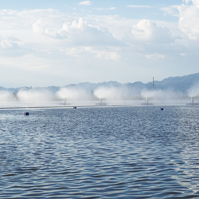 通過(guò)高速旋轉(zhuǎn)葉輪將水破碎至100微米粒徑小液滴,形成水霧,利用自然天氣條件進(jìn)行蒸發(fā)。強(qiáng)制蒸發(fā)的作用:可增強(qiáng)蒸發(fā)效果14~30倍,蒸發(fā)同樣的廢水所需蒸發(fā)塘面積可降低到原來(lái)的1/10。