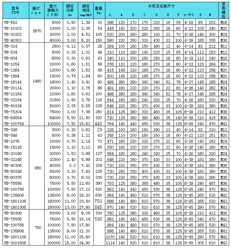 VB-1264-W振動電機外形安裝尺寸技術(shù)參數(shù)表