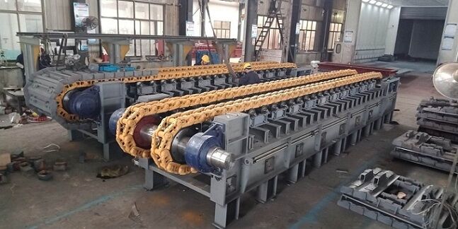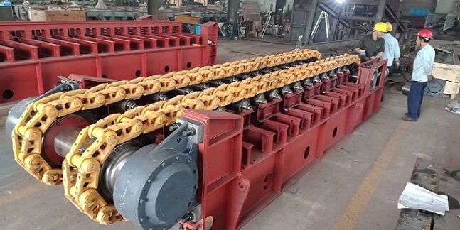 由于板喂機(jī)是通過鏈輪、鏈條、鏈板、傳動等一系列全鋼結(jié)構(gòu)的剛性機(jī)架將物料拖出庫底的。所有的料倉壓力由板式給料機(jī)承擔(dān),避免的由于料倉壓力過大把皮帶秤壓壞現(xiàn)象。