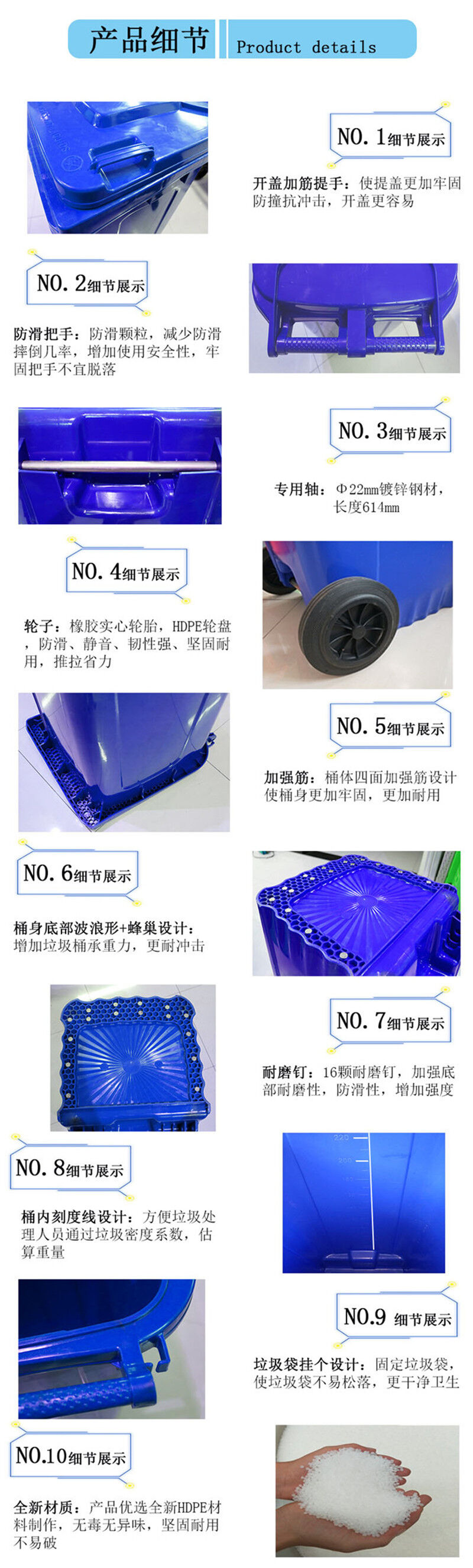 塑料分類垃圾桶經(jīng)久耐用,輕巧靈活,外型美觀,利于環(huán)保,置負(fù)載后輪,可跨越梯級(jí)或路邊臺(tái)階,內(nèi)外表面光潔,便于倒空垃圾與清洗,用于各類公共場(chǎng)所收集廢棄物或原料搬運(yùn),大大提高工作效率,計(jì)符合人體工程學(xué)。2 特點(diǎn)用優(yōu)質(zhì) 工程材料制造輕便耐用,移動(dòng)靈活。種色彩,適用于不同的環(huán)境與垃圾分類收集。