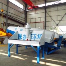 落地式砂石分離機(jī)整套系統(tǒng)主要由:攪拌車加水清洗裝置,溜槽裝置,砂石漿水分離裝置,和泥漿水后處理裝置組成。混凝土輸送設(shè)備清洗后,將殘余混凝土排入溜槽中,在高壓水流沖擊下,經(jīng)溜槽進(jìn)入砂石分離機(jī),在不斷旋轉(zhuǎn)的分離機(jī)作用下,對(duì)混凝土進(jìn)行充分的清洗,同時(shí)將砂石、漿水進(jìn)行分離,分離后的砂、石在導(dǎo)料葉片的作用下背向流動(dòng)至出料口排出分離機(jī)落入振動(dòng)篩分機(jī),通過(guò)篩分將沙、石子分開,分別堆放。清洗后的漿水從分離機(jī)的溢水口排出進(jìn)入濃漿池,經(jīng)污水泵加壓打到旋流器除去多余固體微粒,降低漿水濃度,進(jìn)入攪拌池回收利用。進(jìn)入攪拌池的漿水為了防止沉淀凝固,需通過(guò)攪拌器的作用,攪拌器的工作為間歇式。分離出水泥漿在連續(xù)的攪拌器作用下,再通過(guò)高壓污水泵輸送到攪拌樓中待生產(chǎn)再利用。整個(gè)控制系統(tǒng)設(shè)有手動(dòng)和自動(dòng)控制,方便控制設(shè)置,整個(gè)系統(tǒng)運(yùn)行可靠,故障率低,維護(hù)量少等特點(diǎn)。