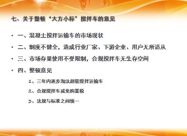 隨后,會長分析了攪拌車的市場現(xiàn)狀,制度不健全,造成行業(yè)廠家、下游企業(yè)、用戶無所適從,市場存量使用不受限制,合規(guī)攪拌車無生存空間;同時提出了建設(shè)性的整頓意見。