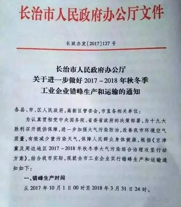 山西省長治市也發(fā)布《關(guān)于進一步做好2017-2018秋冬季工業(yè)企業(yè)錯峰生產(chǎn)和運輸?shù)耐ㄖ贰R笞?017年10月1日00時起至2018年3月31日24時,水泥(含粉磨站)等建材行業(yè)企業(yè)全部停產(chǎn)。