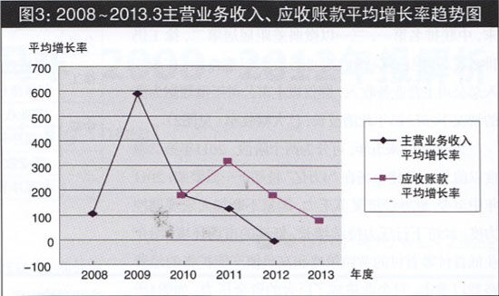 圖3 2008~2013.3主營(yíng)業(yè)務(wù)收入、應(yīng)收賬款平均增長(zhǎng)率趨勢(shì)圖