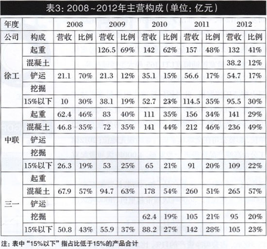 圖4 2008~2012年徐工、中聯(lián)、三一年度主營(yíng)構(gòu)成圖