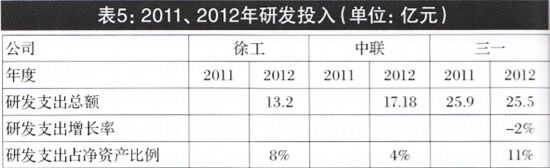 分析2011、2012年報(bào)表明,三一2012年研發(fā)投入25.5億元,占公司凈資產(chǎn)的11%,比2011年減少2%,研發(fā)投入出現(xiàn)下降趨勢(shì);2012年,徐工研發(fā)投入13.2億元,占凈資產(chǎn)的8%;中聯(lián)研發(fā)投入17.18億,占凈資產(chǎn)的4%;徐工、中聯(lián)研發(fā)投入和占比,均低于三一(見(jiàn)表5)。由此可知,在打造公司核心競(jìng)爭(zhēng)力,提升公司價(jià)值方面,三駕馬車研發(fā)投入的趨勢(shì)和占比均存在提升的空間。