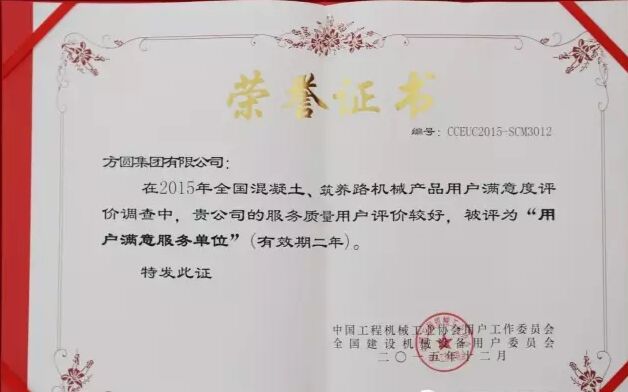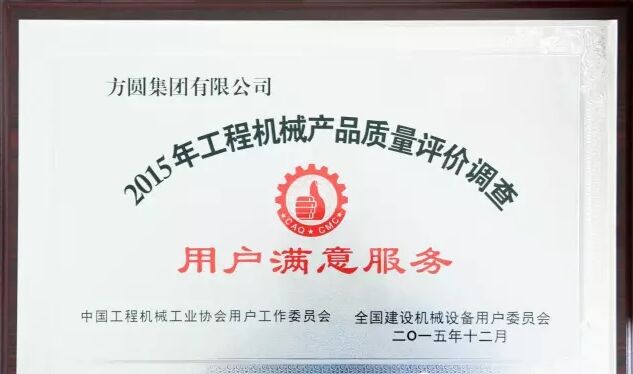 此外,因?yàn)榉綀A集團(tuán)在2015年度全國混凝土機(jī)械行業(yè)用戶滿意度評(píng)價(jià)調(diào)查中,受到廣大用戶的一致好評(píng),被授予“全國混凝土機(jī)械用戶滿意十強(qiáng)企業(yè)”稱號(hào)。在產(chǎn)品質(zhì)量調(diào)查中,連續(xù)七次被評(píng)為“全國用戶滿意單位”。