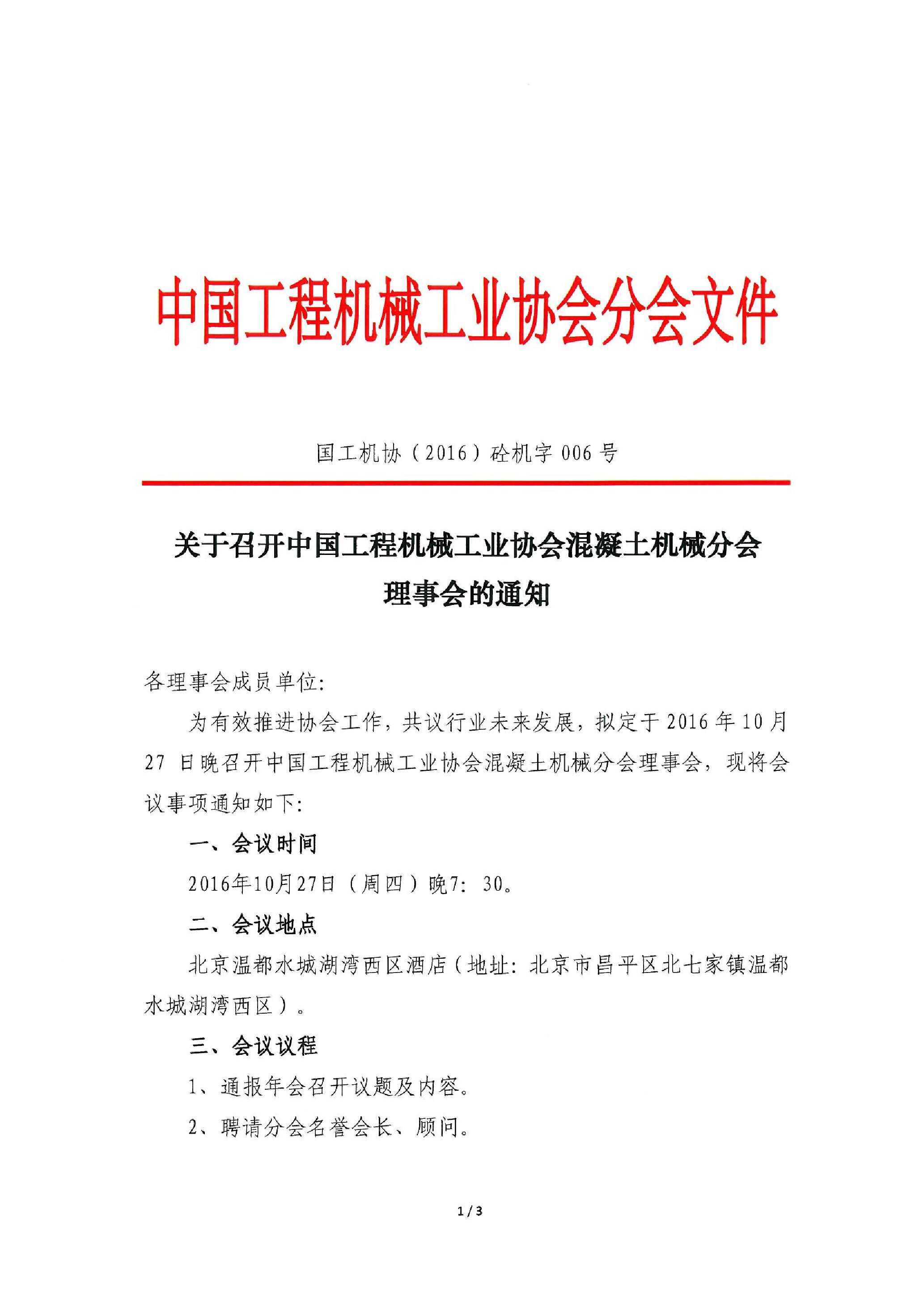 關(guān)于召開中國工程機械工業(yè)協(xié)會混凝土機械分會理事會的通知